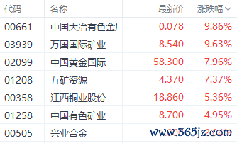 黄金股中,灵宝黄金(03330.HK)、中国黄金国际(02099.HK)、紫金矿业(02899.HK)分别上涨13.41%、7.96%、4.91%。